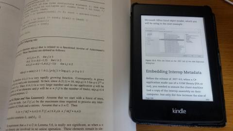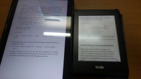 킨들과 마찬가지로 어두운 환경에서는 태블릿이 조금 더 가독성이 좋고, 밝으면 태블릿쪽이 반사광이 더 밝습니다.
