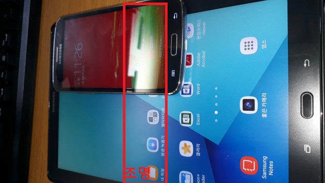 "ㅡ"자 형태의 긴 조명 환경에서 필름이 없는 스마트폰을 필름이 있는 태블릿 위에 나란히 놓은 사진입니다. 필름이 사진상으로도 눈에 확 들어올 정도로 반사를 줄여준 것을 확인 가능합니다.
