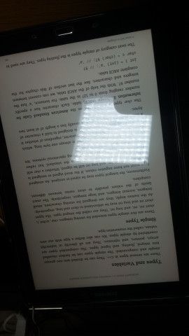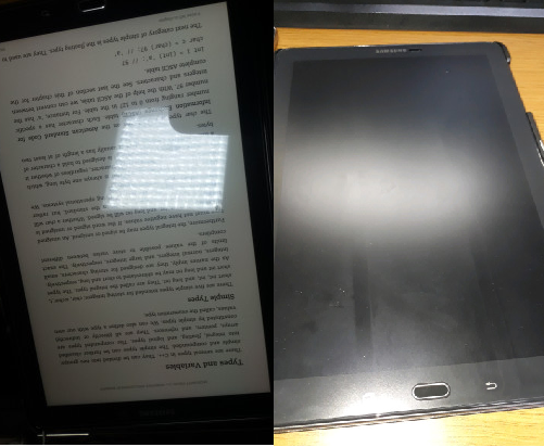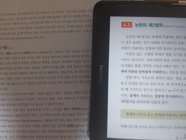 너무 어둡게 찍혀서 반사광 비교는 의미가 없다고 생각해서 번외로 넣었습니다. 조명을 강하게 하고 사진을 찍어봐야 할 것 같은데, 태블릿과 이 북 리더기가 보여주는 것 면에서 생각보다 비슷한 느낌을 보여줍니다.