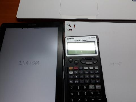 필름이 없는 계산기와 필름이 있는 태블릿에 각각 "234567"을 쓰고 비교한 사진입니다. 사진을 찍고 보니 글씨 위치가 조명 정 가운데에 오질 않아서 직접 비교는 실패했지만, 그래도 반사를 어느정도 줄여줬는지 짐작은 할 수 있습니다.